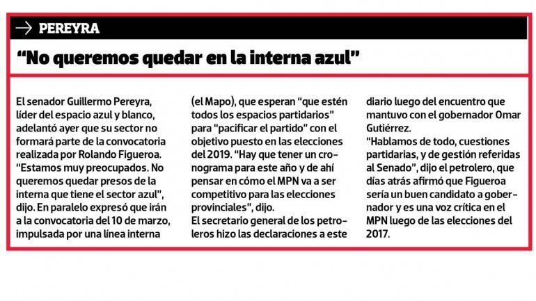 Informó que, como titular de la Junta del MPN, él también viene participando de encuentros con varios referentes partidarios, entre ellos el senador y líder petrolero Guillermo Pereyra, con el que iba a verse ayer por la tarde (ver aparte). Pereyra venía siendo una voz crítica al sector azul y tuvo gestos de acercamiento a Figueroa.