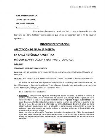 El tema es sorprendente y se ha manejado con cautela y silencio, hasta estos días donde parte del asfalto en algunas calles del barrio Sarmiento está hundido y comienza a brotar agua de depósitos en supermercados, en una compañía de telefonía y escuelas en unas cinco manzanas. El vecino pidió la intervención urgente de algún organismo provincia, en este caso, el Ente Provincial de Agua y Saneamiento (EPAS), para determinar qué es lo que sucede con las napas en algunos sectores de Centenario.