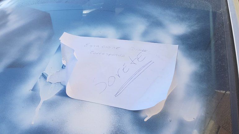 No dudó ni un segundo y enseguida se descargó. Le pintó las ventanillas y el parabrisas con aerosol blanco y le dejó un mensaje en un papel: "Estacione donde corresponda", pidió y luego escribió enfurecido "Sorete" con letra aún más grande y subrayado, para no dejar dudas de la ira que le provocó el automovilista infractor.