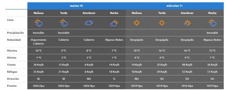 El miércoles no se esperan lluvias, pero el amanecer será fresco con un pronóstico de -4°C. Durante el día el termómetro irá subiendo con la salida del sol y podría alcanzar los 16 grados. Sin embargo, para la tarde están pronosticadas algunas ráfagas que llegarían hasta los 55 km/h.