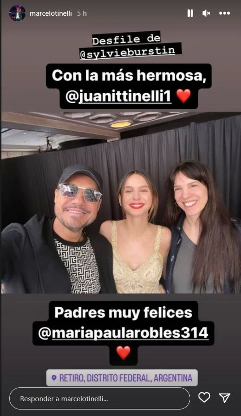 Mediante sus historia de Instagram, el conductor mostró que estaba en uno de los desfiles de su hija, aunque sorprendió al revelar que no estaba solo. “Los padres de la nena que desfila”, comentó en una de las fotos, mientras esperaban con Juanita, quien lució los últimos modelos de Sylvie Burstin.