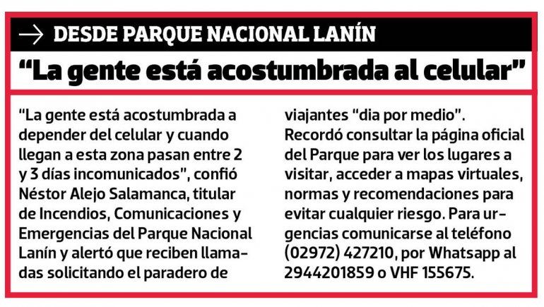 La cordillera atrae a miles de turistas cada verano, que deciden escapar de las grandes ciudades para adentrarse en la tranquilidad de la montaña. Sin embargo, muchas veces no conocen que en esos destinos no hay acceso a señal de telefonía o de datos móviles, lo que conlleva a que familiares se preocupen por la falta de comunicación. Desde Policía y Parques Nacionales se recomienda asesorarse para alertar previamente a sus allegados.