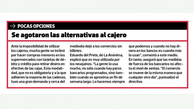 NEUQUÉN - El paro lanzado por la Asociación Bancaria fue contundente ayer en la ciudad y generó molestias en muchos usuarios. Pocos cajeros tenían dinero y se convirtieron en el epicentro de largas colas, especialmente por la mañana, mientras que otros estaban fuera de servicio. Los supermercados se vieron sobrepasados por la demanda de efectivo y dejaron de entregar cerca del mediodía.