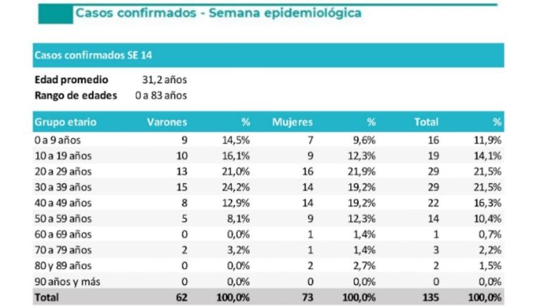 El parte mostró que hay 73 mujeres contagiadas y 62 hombres. Marcó, además, que el virus afectó en su mayoría a niños y jóvenes, mientras que los adultos mayores no fueron afectados en los últimos tiempos por el coronavirus.