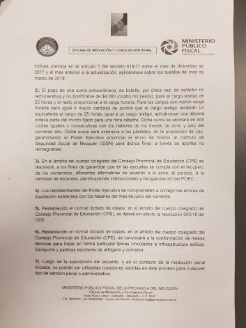 Tras siete horas de deliberaciones en el marco de la mediación judicial, esta noche el Gobierno y el gremio ATEN firmaron un acta de cierre del fin de semana de negociaciones.