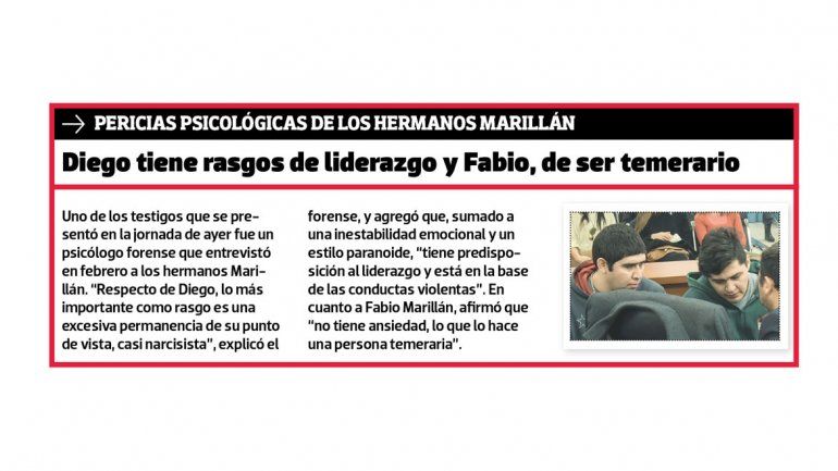 Además, testificaron peritos, psiquiatras y psicólogos forenses que intervinieron en la investigación y que entrevistaron a Luciano Hernández, Osvaldo Castillo, Andrea Peruca y Diego y Fabio Marillán, los cinco acusados por el crimen de la joven en Rincón de los Sauces, ocurrido el 20 de julio de 2017.