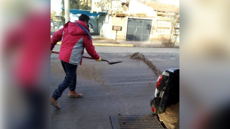 Con el pronóstico y el termómetro en mano, los equipos de Defensa Civil del Municipio salieron para esparcir sal en los puntos donde se registró mayor acumulación de hielo tanto en la Autovía Norte como en Ruta 7 al igual que en las principales arterias de la ciudad.