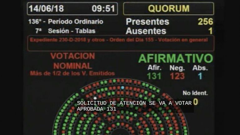 La votación se dio pasadas las 9.45 y el primer resultado arrojó 131 votos a favor del proyecto de despenalización del aborto y 123 en contra, pero luego dos diputados manifestaron que su voluntad fue mal computada y el resultado final fue 129 a favor, 125 en contra, una abstención y una ausencia.