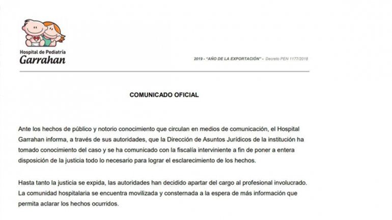 Tras la detención del pediatra, las autoridades del hospital lanzaron un comunicado para manifestar que la comunidad de ese centro de salud se encuentra "movilizada" y consternadaa la espera de más información que permita aclarar los hecos ocurridos.