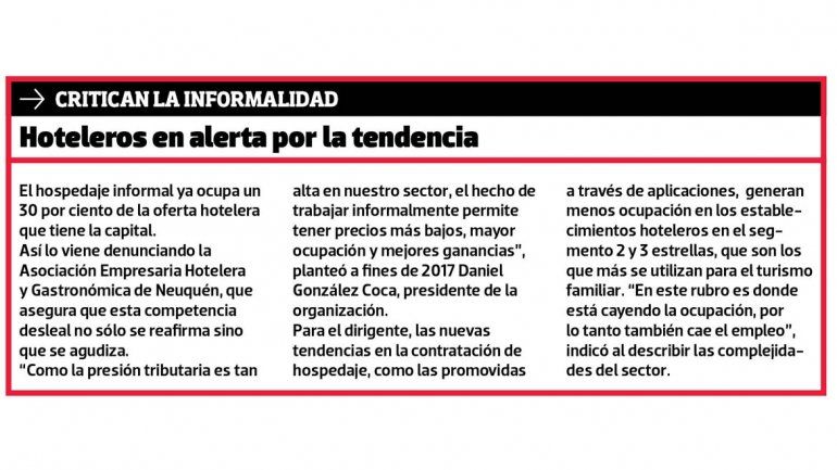Con su presencia en la zona, las empresas y emprendimientos que se formaron a partir del concepto de la economía colaborativa empezaron a recibir serios planteos desde diferentes frentes del mercado turístico, ya que este tipo de rentas no están contempladas en la mayoría de las reglamentaciones comerciales. Lo cierto es que si bien el modelo de negocio se da de manera incipiente, está en crecimiento en la región, situación que los gremios hoteleros exponen como “competencia desleal”, en un rubro que luego del petróleo conforma la segunda actividad económica de la provincia, con una fuerte incidencia de los centros turísticos de la cordillera.