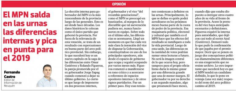 Con el gobernador Omar Gutiérrez y el vice Rolando Figueroa frente a frente, el Movimiento Popular Neuquino tendrá hoy sus internas abiertas para definir quién será el candidato en las elecciones provinciales del 2019.
