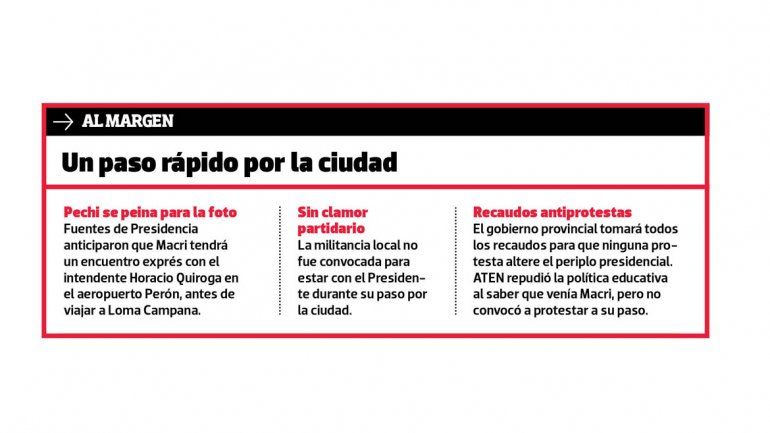 La agenda de la visita presidencial no fue precisada a los medios. La latencia de una protesta gremial es uno de los factores que propició el máximo hermetismo. Además, el Presidente llega a Neuquén con una agenda vinculada a la matriz energética cuando está caliente el reclamo contra la política tarifaria de su gobierno. El desembarco en Vaca Muerta es leído como un refuerzo a la apuesta por la política energética de Aranguren.