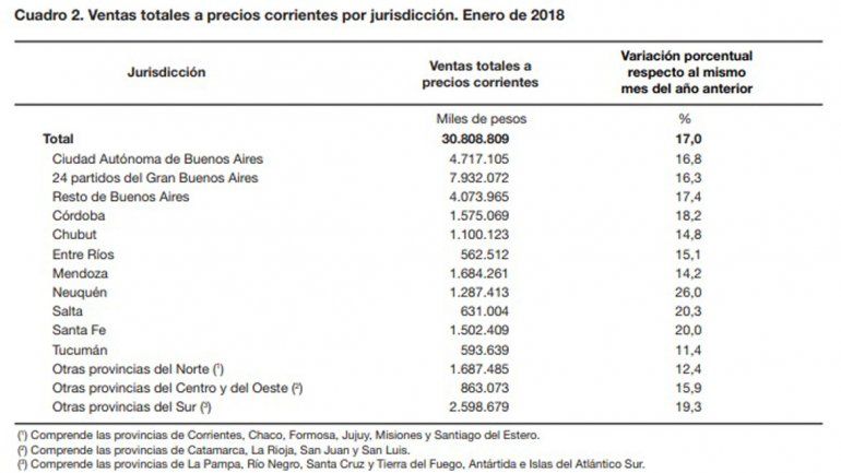 Las jurisdicciones donde se registraron las subas más importantes fueron: Neuquén, 26,0%; Salta, 20,3%; Santa Fe, 20,0% y “Otras provincias del Sur”, 19,3%.