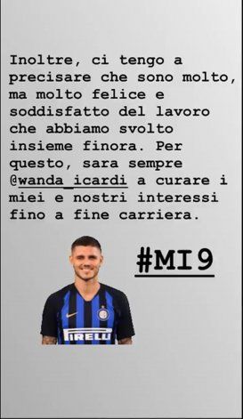 Además, Icardi se refirió a una nota del diario Gazzetta dello Sport: "Quiero aclarar a todos los lectores que leen a pseudoperiodistas y diarios serios que escriben sin saber, o les dan instrucciones de escribir sin tener una idea real de los hechos, que mi renovación sucederá en el momento en que Inter me haga una oferta correcta y concreta. Solo allí se podrá hablar de renovación con verdad, eludiendo las mentiras gratuitas que hoy se difunde".