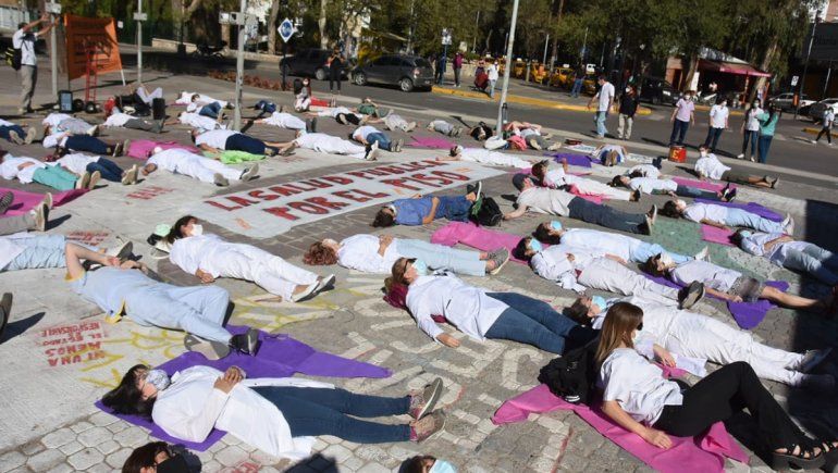 El personal de salud disidente con el gremio ATE se manifestó nuevamente en reclamo de un nuevo acuerdo salarial con el gobierno provincial. Esta vez, hicieron una fuerte intervención en pleno monumento a San Martín, donde permanecieron quince minutos tirados en el piso, bajo el lema "la salud por el piso".