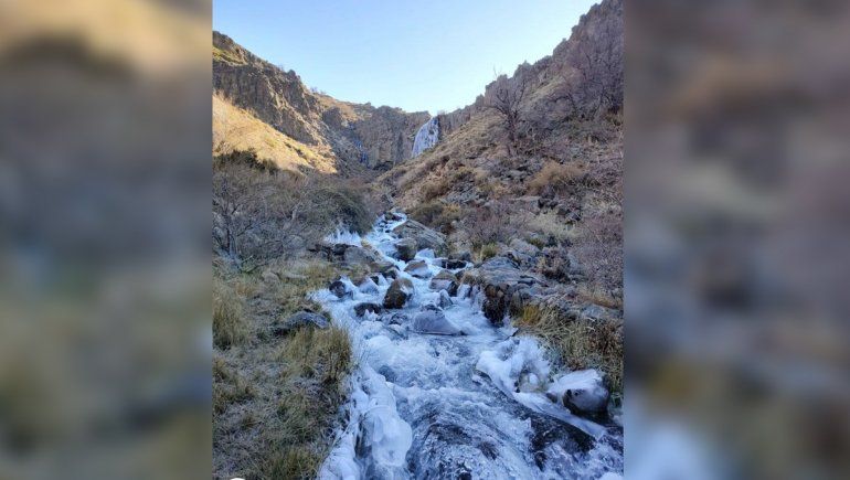 Lugares como la Cascada La Fragua estuvo estos días prácticamente congelada. Según el guardafauna Martín Muñoz, asentado en Varvarco, “la cascada está aproximadamente en un 70% congelada”.