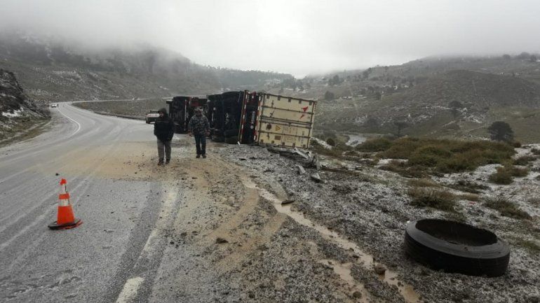 El paso internacional permanece cerrado desde las 13 debido a las malas condiciones climáticas que azotan a la zona. En este caso, el camión chileno que transportaba mercaderías perdió el control por la presencia de hielo en la calzada, volcó y quedó tendido sobre la banquina.