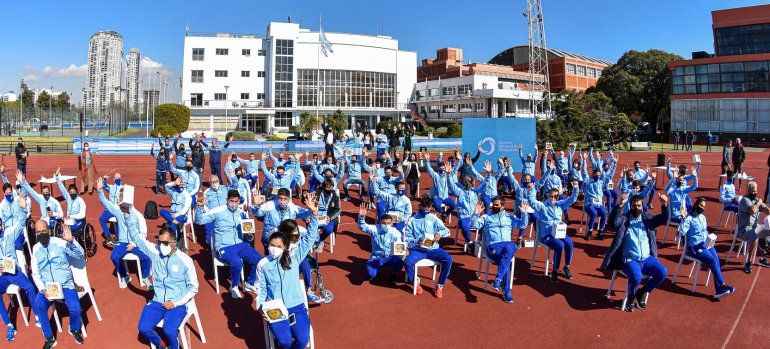 “El deporte nos ayuda a construir identidad todos los días. En esta bandera están sus familias, amigos y amigas, están sus amores, sus ciudades y sus provincias que los vieron crecer. Y en esta bandera también están los millones de argentinos y argentinas que vamos a estar alentándolos y alentándolas, deseando que disfruten de esta experiencia”, motivó Arrondo en su mensaje a los 57 deportistas presentes.