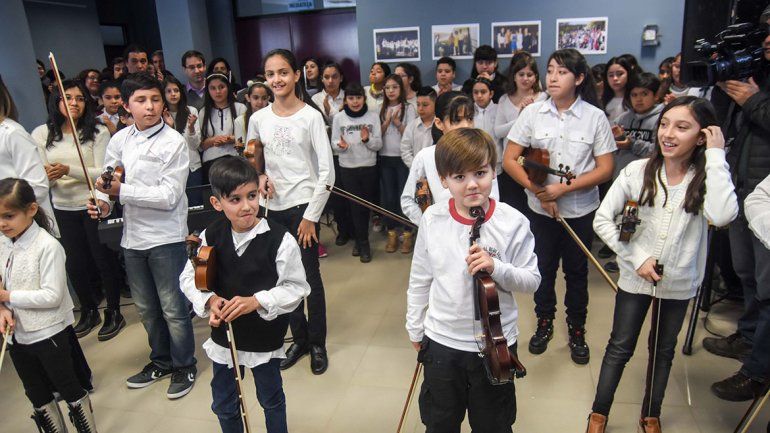 Gutiérrez saludó a los niños que tocan violín y también se acercó a los integrantes del coro quienes entonaron dos canciones con el acompañamiento de un piano.