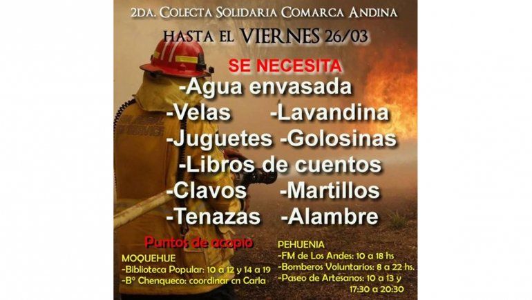 Los Bomberos Voluntarios de Villa Pehuenia y Moquehue decidieron realizar una segunda colecta en la zona para los damnificados por los incendios de la comarca andina.