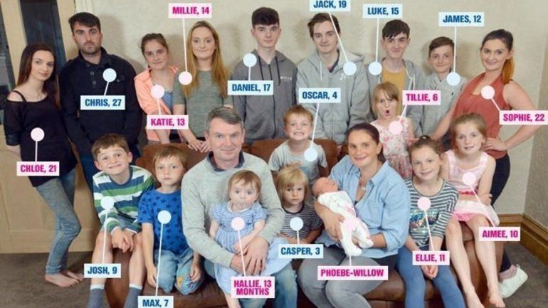 Un matrimonio británico está esperando a su hijo número 21, lo que los convertirá en la familia más extensa del Reino Unido y quizás, también, del mundo entero. La mujer dio a luz a su primer hijo en 1990, cuando tenía 14 años. Desde entonces, la pareja tuvo nueve mujeres y diez varones.