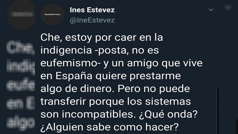 El domingo por la tarde, la actriz volvió a dirigirse a sus seguidores y se refirió al momento personal que está atravesando, condicionada por la cuarentena: "Che, estoy por caer en la indigencia -posta, no es eufemismo- y un amigo que vive en España quiere prestarme algo de dinero. Pero no puede transferir porque los sistemas son incompatibles. ¿Qué onda? ¿Alguien sabe cómo hacer?”.