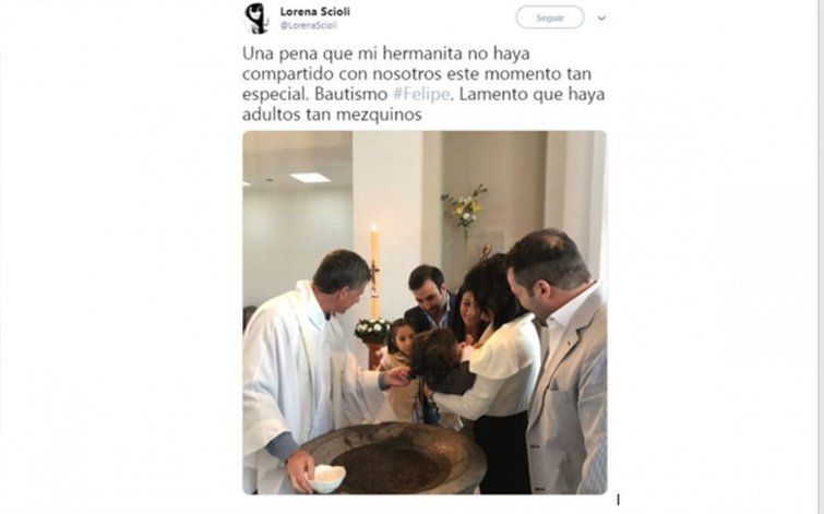 "Una pena que mi hermanita no haya compartido con nosotros este momento tan especial. Bautismo #Felipe. Lamento que haya adultos tan mezquinos", lanzó en un mensaje, junto a una foto del evento.