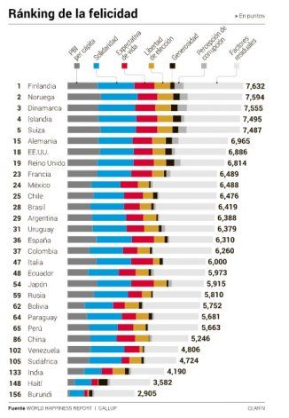 Como viene pasando año tras año, los países nórdicos son los más felices: Finlandia es el primero, con una puntuación de 7,632 sobre 10, seguido por Noruega, Dinamarca, Islandia, Suiza, Holanda, Canadá, Nueva Zelanda, Suecia y Australia.