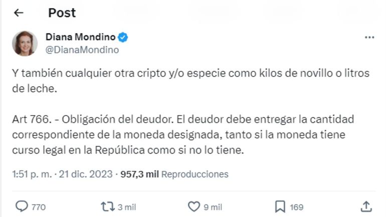 A su vez, continuó el hilo con una afirmación curiosa en la que afirmó que también se podrán pactar contratos en cualquier otra criptomoneda, así como en especies "como kilos de novillo o litros de leche".