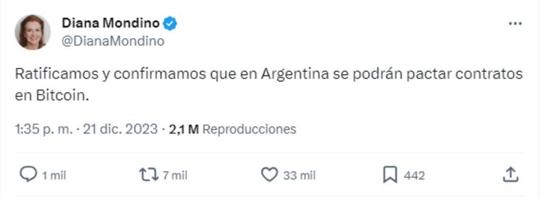 En ese sentido, a través de su cuenta de la red social X, Mondino indicó: "Ratificamos y confirmamos que en Argentina se podrán pactar contratos en Bitcoin".