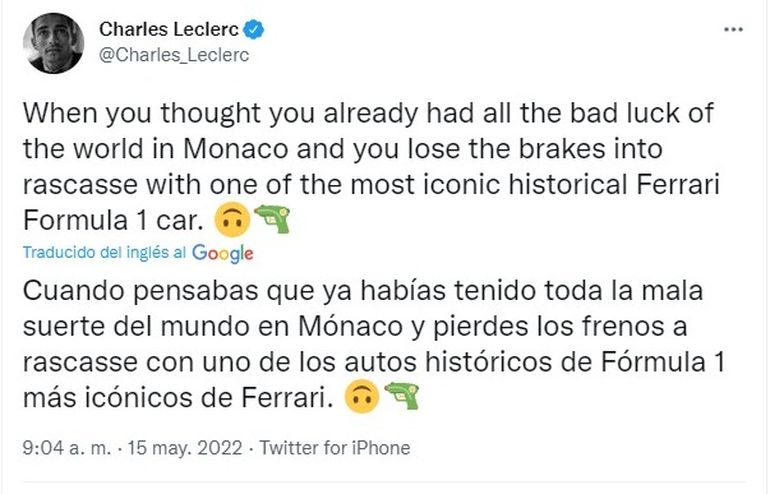 Horas más tarde, el monegasco lamentó lo ocurrido con un mensaje con cierto humor en su cuenta de Twitter: “Cuando pensabas que ya habías tenido toda la mala suerte del mundo en Mónaco, pierdes los frenos en la Rascasse con una de las Ferraris más icónicas de la historia de la Fórmula 1″.