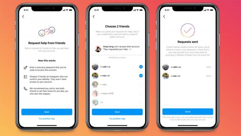 La empresa también reveló que está probando una forma de que los usuarios pidan a sus amigos que confirmen su identidad para volver a acceder a sus cuentas. La función solicita primero una contraseña anterior que hayas utilizado para acceder a tu cuenta. A continuación, tendrás que elegir a dos amigos en Instagram que puedan confirmar tu identidad. Cuando envíes una solicitud de ayuda, los usuarios tendrán que responder en un plazo de 24 horas. Si ambos amigos confirman tu identidad en 24 horas, podrás crear una nueva contraseña. Si no lo hacen, tendrás otra oportunidad de elegir a dos amigos diferentes. Instagram dice que pronto tendrá más información sobre esta función.