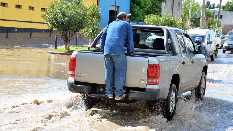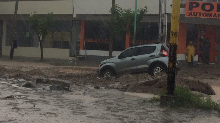 Con la fuerte lluvia se anegaron varias calles y se viralizaron algunas fotos como la de un automóvil que terminó arriba de un montículo de tierra en la esquina de San Martín y Catriel, por ejemplo.