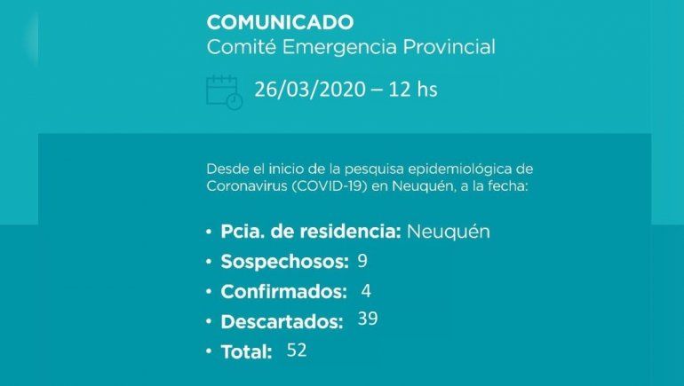 Hasta el momento en Neuquén se han descartado 59 casos, mientras que se confirmaron cuatro positivos. El último fue el miércoles por la noche en la ciudad de Zapala, que constituyó el primer caso en el interior provincial.