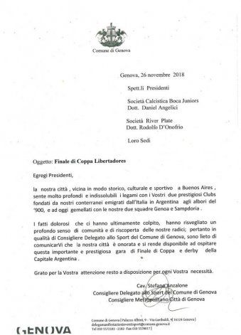 Stefano Anzalone, director de Deportes de Génova, ubicada al noroeste del país, envió una carta para que el encuentro definitorio de la Copa Libertadores se juegue en esa ciudad.