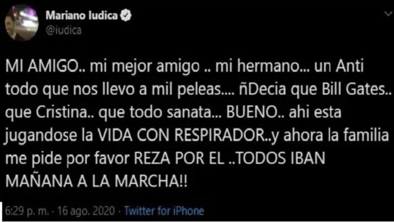 "Mi amigo, mi mejor amigo, mi hermano, un anti todo que nos llevó a mil peleas, decía que Bill Gates, que Cristina, que todo sanata. Bueno, ahí está, jugándose la vida con respirador y ahora la familia me pide 'por favor, rezá por él'. ¡Todos iban mañana a la marcha!", posteó el conductor de Polémica en el Bar (América) mientras desde distintas trincheras los usuarios de Twitter se posicionaban los hashtags #17ASalimosTodos y #YoNoMarchoEl17.