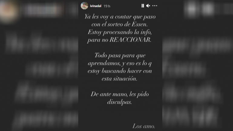 Tras estas publicaciones, Nadal compartió en sus historias el siguiente mensaje: “Ya les voy a contar qué pasó con el sorteo. Estoy procesando la info para no reaccionar. Todo pasa que aprendamos y eso es lo que estoy buscando hacer con esta situación. De ante mano les pido disculpas”, lanzó.