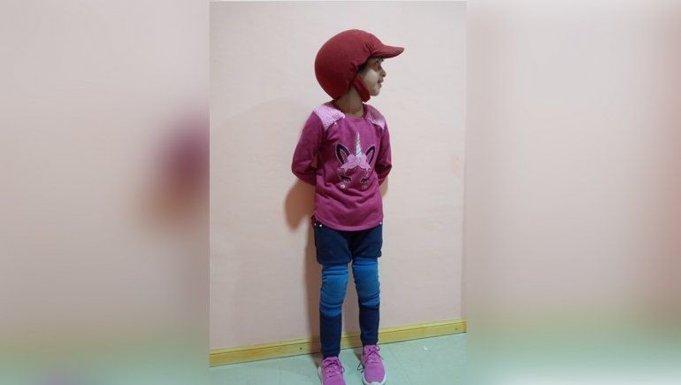 Debido a las convulsiones que sufre, Jazmín lleva un casquito de ciclista adaptado a su cabeza para protegerla de las caídas cuando se desploma en el suelo; y rodilleras de patín. "Su abuela, para que se vea más bonita mi nena, lo cubrió con tela y le puso un agarre", contó su familia.