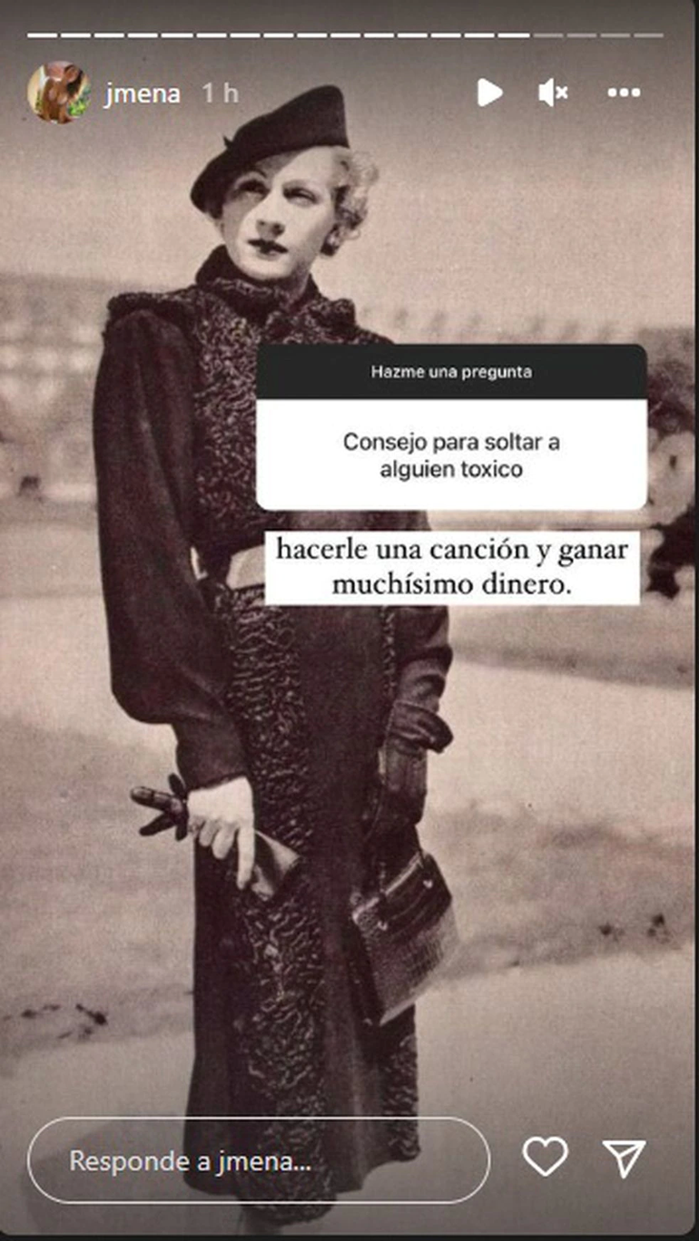 En una de sus storie de Instagram, un seguidor le pidió un consejo para “poder soltar a alguien tóxico”. A lo que Jimena no dudó en responderle con el aval de su propia experiencia: “Hacerle una canción y ganar muchísimo dinero”.