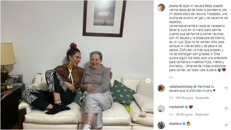 “Ayer mi abuela Beba aceptó verme después de toda la pandemia (de mi doble dosis de vacuna, hisopado, una ducha de alcohol en gel y de sacarme los zapatos)”, contó en ese momento.