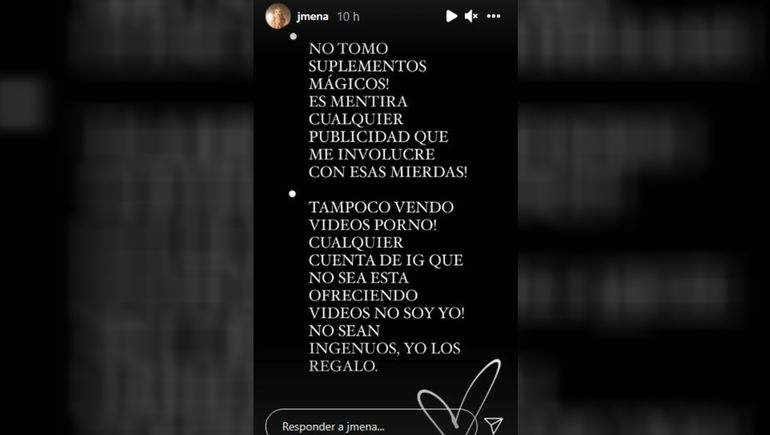 En este sentido, la cantante y actriz usó su cuenta de Instagram para hacer su descargo y comenzó hablado del timo publicitario con el cual se comercializaban videos eróticos, con Jimena como protagonista. "¡No vendo videos porno! ¡Cualquier cuenta de Instagram que no sea esta ofreciendo videos, no soy yo! No sean ingenuos, yo los regalo", expresó con ironía.
