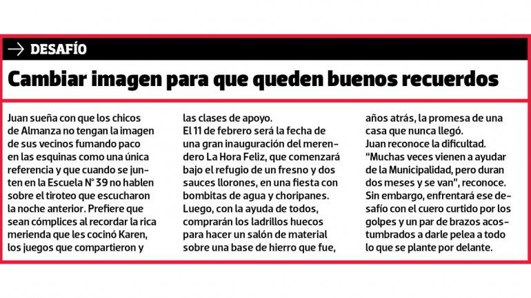 “Lo más obvio era vender el terreno para comprar la cocina y el calefactor de la casa nueva, pero yo siempre quise ayudar a los chicos del barrio”, señala Juan. “No me animaba a planteárselo a mi esposa, pero al final fue ella la que lo propuso”, agrega mientras Karen, de 30 años, lo mira con una sonrisa y aclara que será ella la encargada de preparar la leche en el merendero.