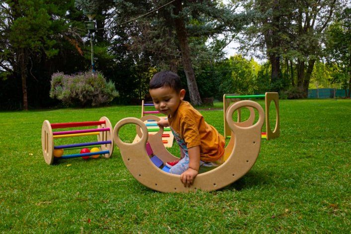 Para los más chicos las propuestas tienen que ver con juegos para acompañar el desarrollo psicomotriz de a cuerdo a su etapa. Escalar, trepar, pasar por dentro. Arman una plaza alternativa con balancín, rampa, triángulo, cubos.