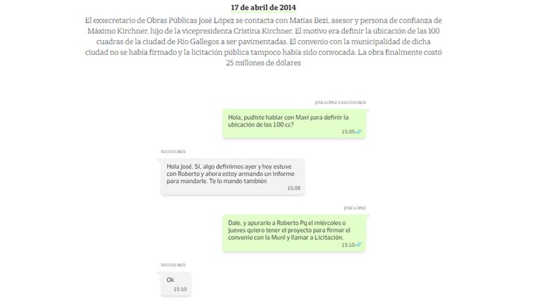 En función de los intercambios de ese y otros mensajes, la fiscalía dio por probado que “antes de la convocatoria ya estaban hablando con integrantes de la empresa de Lázaro Báez: un direccionamiento claro y evidente”.