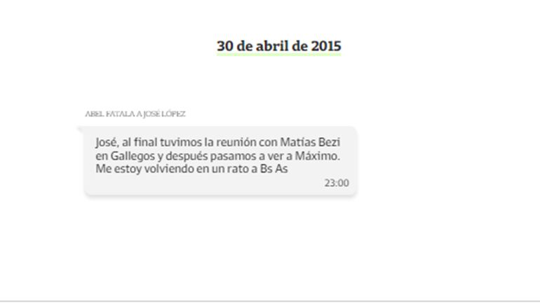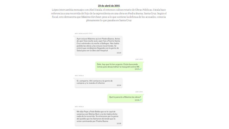 El ex subsecretario de Obras Públicas Abel Fatala, imputado en este caso, también intercambió mensajes con José López respecto de las obras para Santa Cruz. “Esos intercambios mostraron que Máximo Kirchner recorría las obras con Matías Bezi, tenían conocimiento de lo que pasaba en Santa Cruz”, indicó Luciani. “Sabían y manejaban lo que pasaba en Santa Cruz”.