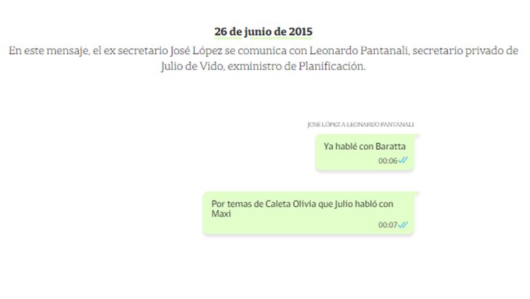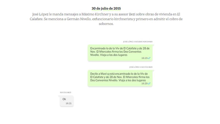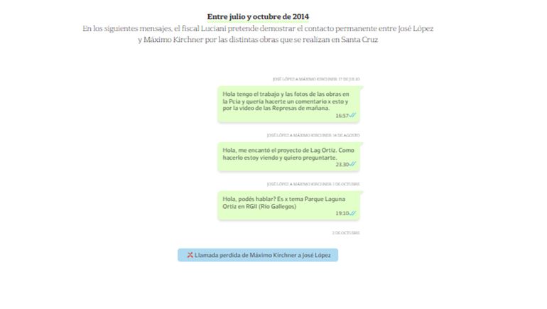 Después continuaron unos mensajes de José López directamente para Máximo Kirchner: “Tengo el trabajo y las fotos de las obras en la provincia y quería hacerte un comentario por esto y por el video de las represas”, se leyó que escribió López. En otro mensaje, el secretario de Obras Públicas le dice “Hola (Máximo) me encantó el proyecto del Lago Ortíz , cómo hacerlo estoy viendo y quiero preguntarte”.