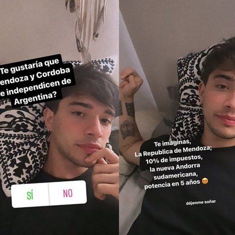 “¿Te gustaría que Mendoza y Córdoba se independicen de Argentina?”, preguntó Serrano en Instagram y habilitó las opciones “Sí” y “No”, en modo encuesta. Antes de esperar resultados, aventuró un escenario ante esta probable independencia de la provincia: “Te imaginás. La República de Mendoza; 10% de impuestos, la nueva Andorra sudamericana, potencia en 5 años”, dijo con el emoji “enamorado”. “Déjenme soñar”, pidió, al margen.