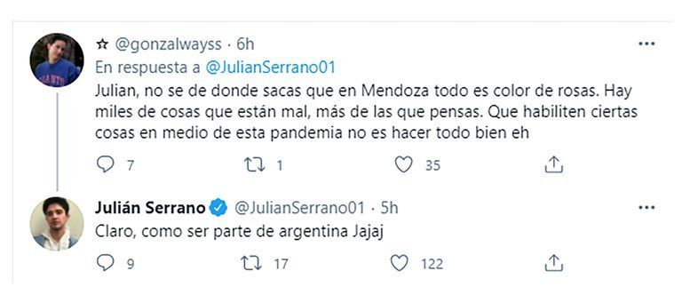 Entre las críticas recibidas por sus comentarios en esta red social, un usuario le dijo: “Julián, no sé de donde sacas que en Mendoza todo es color de rosas. Hay miles de cosas que están mal, más de las que pensas. Que habiliten ciertas cosas en medio de esta pandemia no es hacer todo bien, eh”. “Claro, como ser parte de Argentina, jajaj”, se burló el influencer.