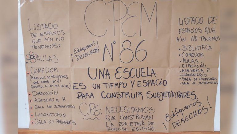 La primera etapa del CPEM 86 fue inaugurado en el 2016 y aún falta una segunda etapa para dar solución a la falta de espacio. Paillalauquen señaló que faltan aulas y que algunos chicos van a terminar de cursar el secundario en tráileres que carecen de calefacción para el invierno y de aire a condicionado en el verano.