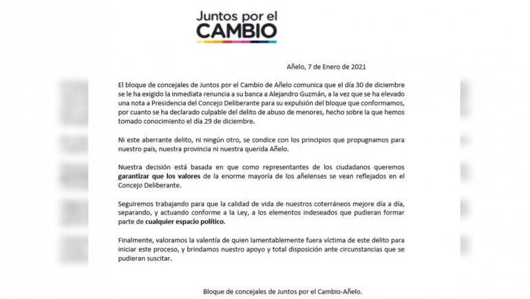 Tras la repercusión de la noticia sobre la condena por abuso sexual del concejal de Añelo, Alejandro Guzmán, contra una niña y la confirmación de su renuncia, el partido en el que se desempeñaba confirmó su apartamiento del núcleo y repudió el hecho.